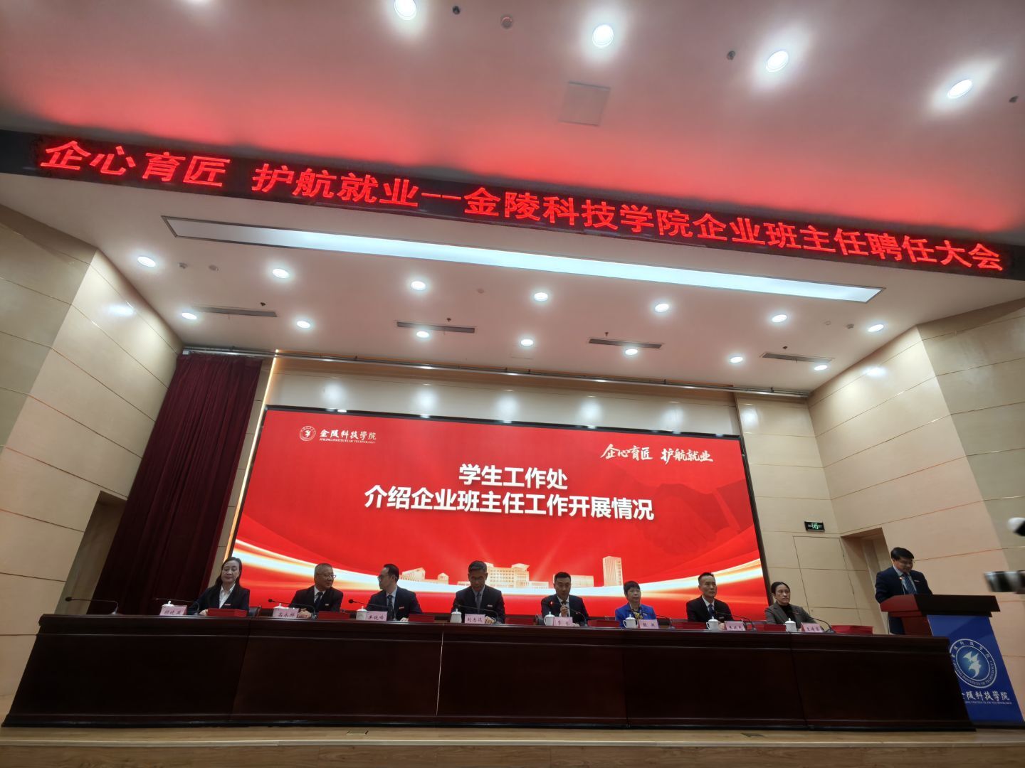 2025年11月26日,金陵科技学院企业班主任聘任大会在金陵科技学院科技楼报告厅举行。江苏J9国际站 J9科技(集团)股份有限公司唐佩、徐敏博、罗涛、孙文雅同志受聘金陵科技学院软件学院企业班主任,并随后在学院组织下,参观金陵科技学院科创空间,参加学院研讨会。